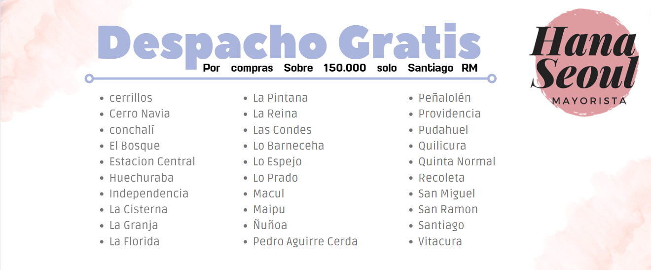 Despachos Gratis por compras igual o superior a los $150.000 pesos únicamente para comunas que estén dentro de la región metropolitana de Santiago.